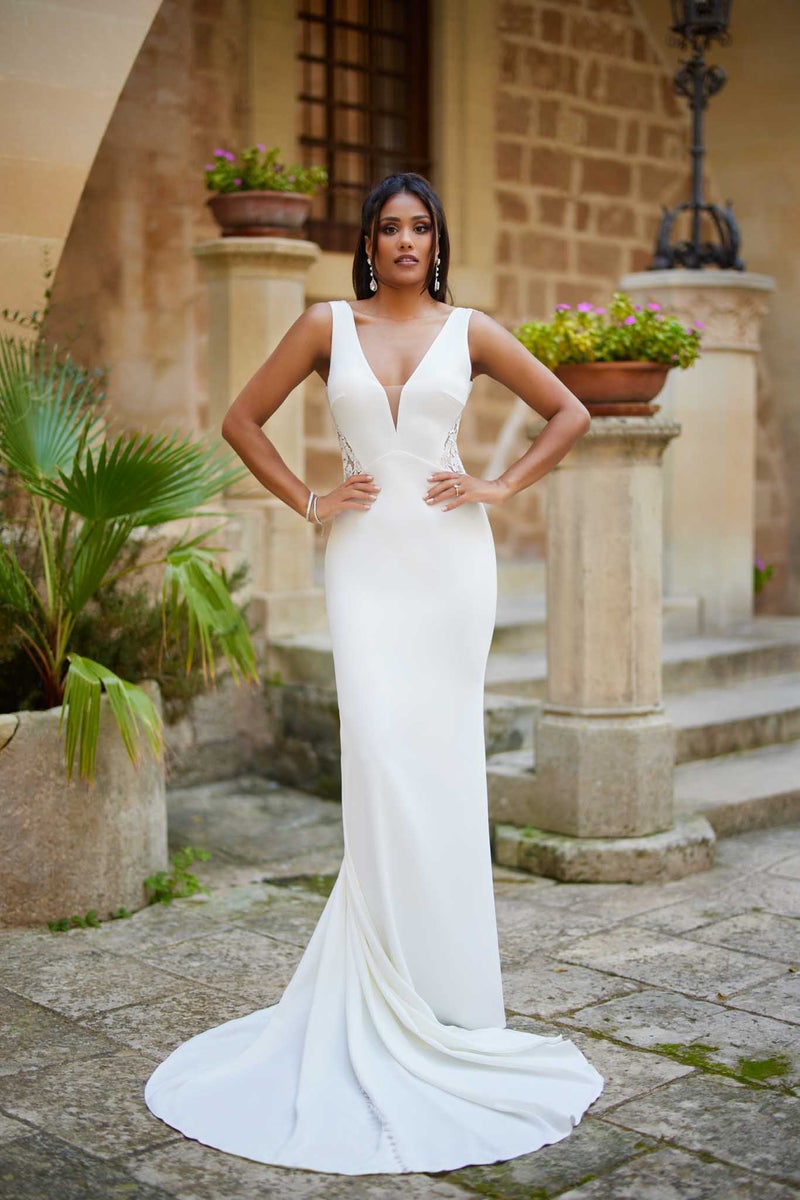 Tässä ylellisessä ja elegantissa kreppigeorgette-merenneitotyylisessä häämekossa on kaunis V-muotoinen pääntie ja herkät V-muotoiset pitsipaneelit takana. Hameessa on myös tyylikkäät kangasnapit, jotka laskeutuvat vyötäröltä laahuksen päähän luoden dramaattisen ilmeen.